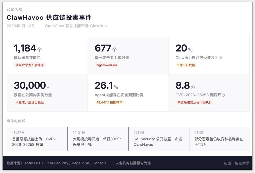 2月爆發的《ClawHavoc》供應鏈投毒事件,1184個惡意技能被植入,影響超過13.5萬臺設備。有用戶因爲把谷歌賬號接入了有問題的Skills,觸發平臺異常檢測,整個谷歌賬號直接被封,郵箱、油管全沒了。