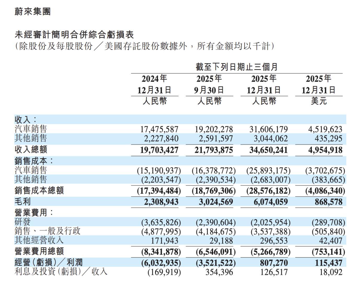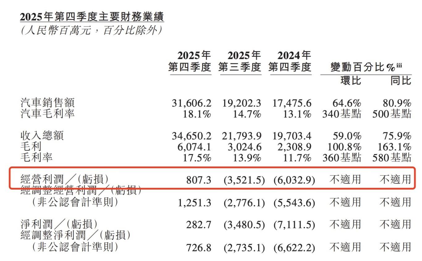 財報顯示,2025年第四季度,蔚來實現經營利潤8.07億元,淨利潤2.83億元——這是公司成立11年來首次錄得單季盈利。