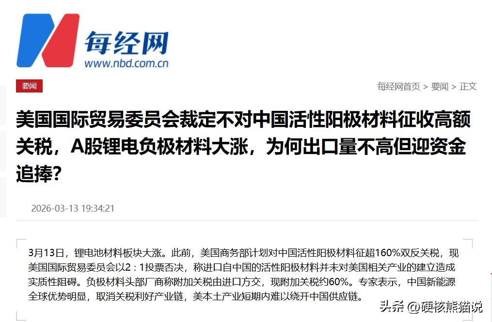 結果,美國自己宣佈不制裁了,原因就是從中國進口的活性陽極材料,沒有影響美國本土產業的建立,所以不能加徵關稅。