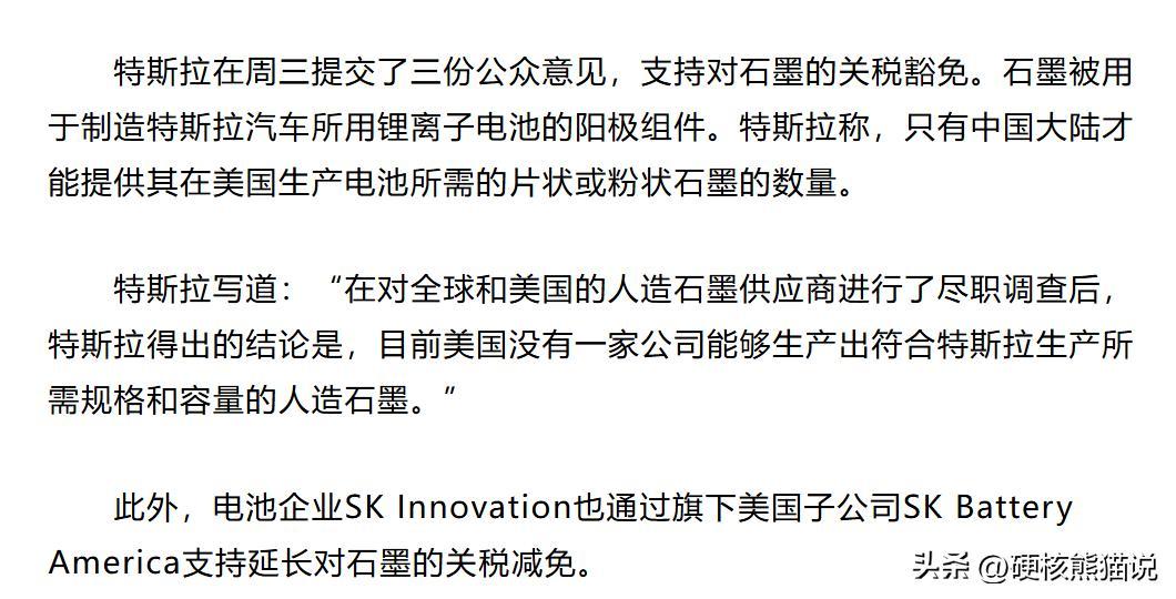 先前美國也是對中國電池材料增加關稅,結果很多美國企業跑出來抗議,比如2024年,特斯拉這些車企就跟美國政府申請過,要求豁免合成石墨的關稅。