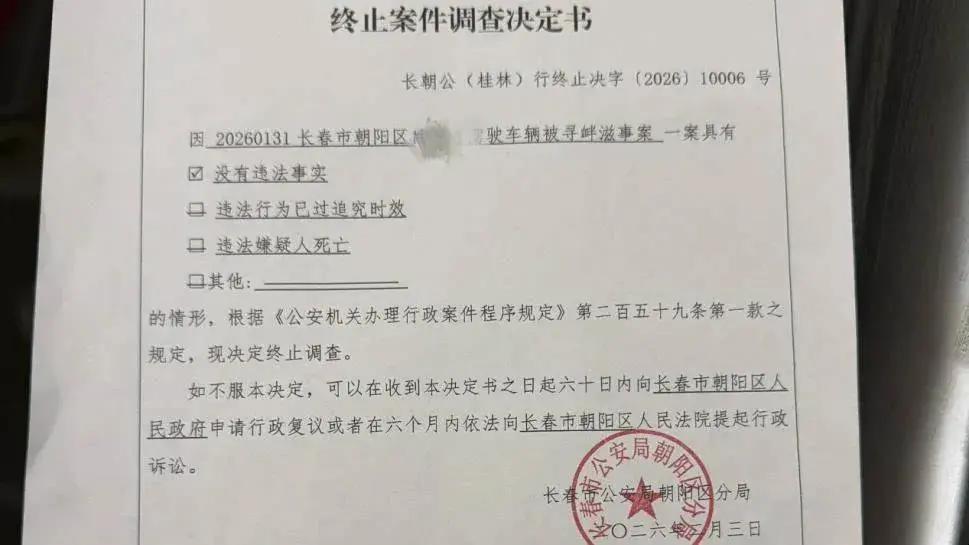 1月28日,呂先生自行前往桂林路派出所報警,指控路虎車主尋釁滋事。1月31日,派出所出具行政案件立案告知書。然而,2月3日,長春市公安局朝陽區分局以沒有違法事實爲由,向呂先生出具《終止案件調查決定書》。呂先生不服,隨後向交管、公安等多個部門申請了複議。