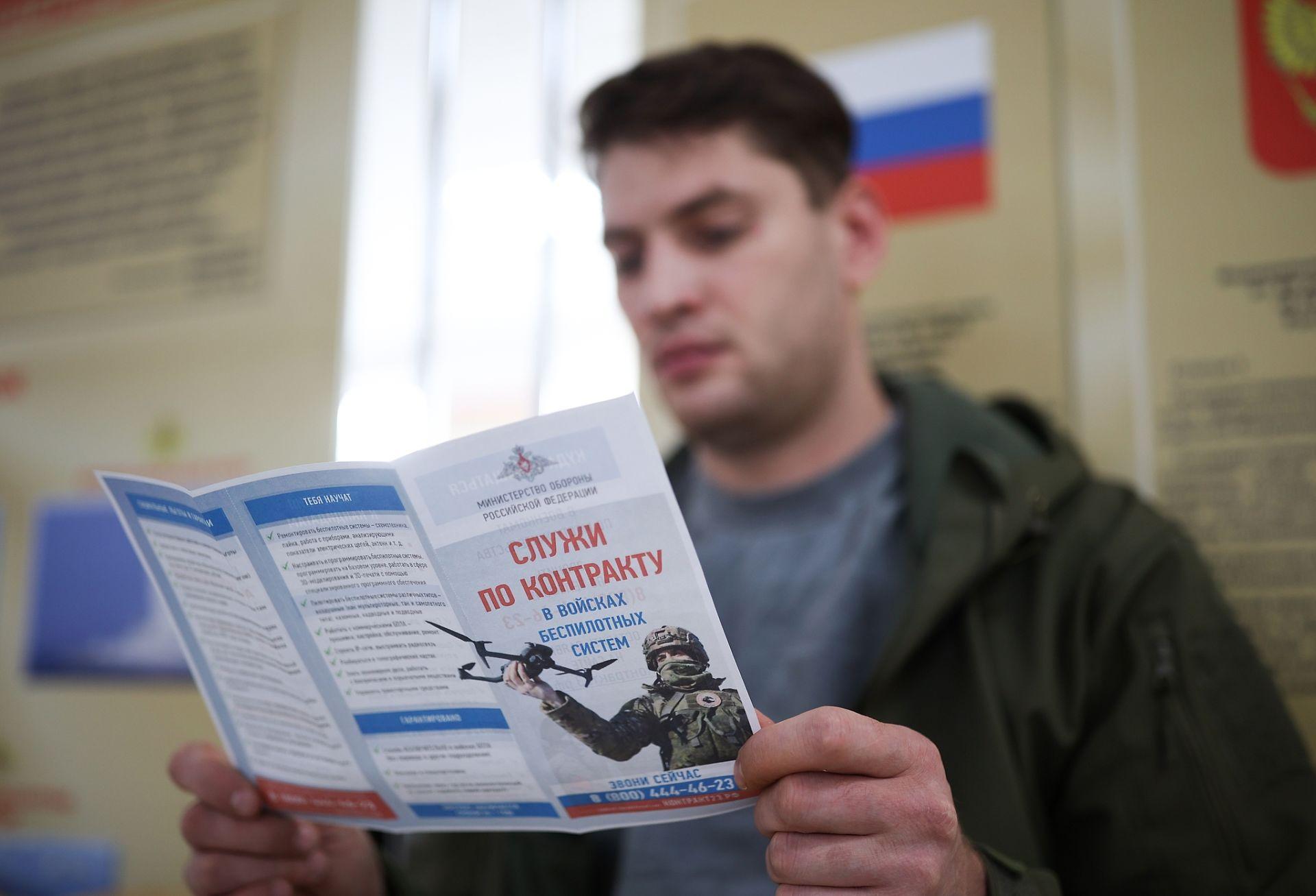 當地時間2026年2月5日,俄羅斯克拉斯諾達爾,一名男子在合同制徵兵中心閱讀宣傳無人機部隊服役的傳單。圖/視覺中國
