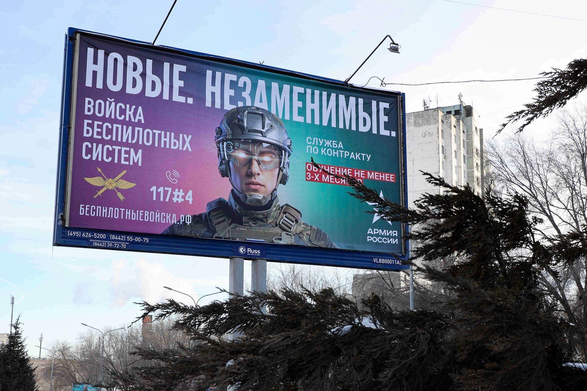 當地時間2026年2月11日,俄羅斯伏爾加格勒,一面宣傳俄羅斯陸軍無人系統部隊合同兵役的橫幅。圖/視覺中國