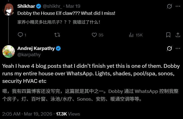 是的,多比已經通過WhatsApp控制了Karpathy的整個房子。
