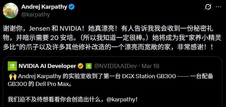 這一次,收貨的是Vibe Coding的提出者,是Agentic Engineering的領軍人物,是Token經濟最具象的消費者——Andrej Karpathy。