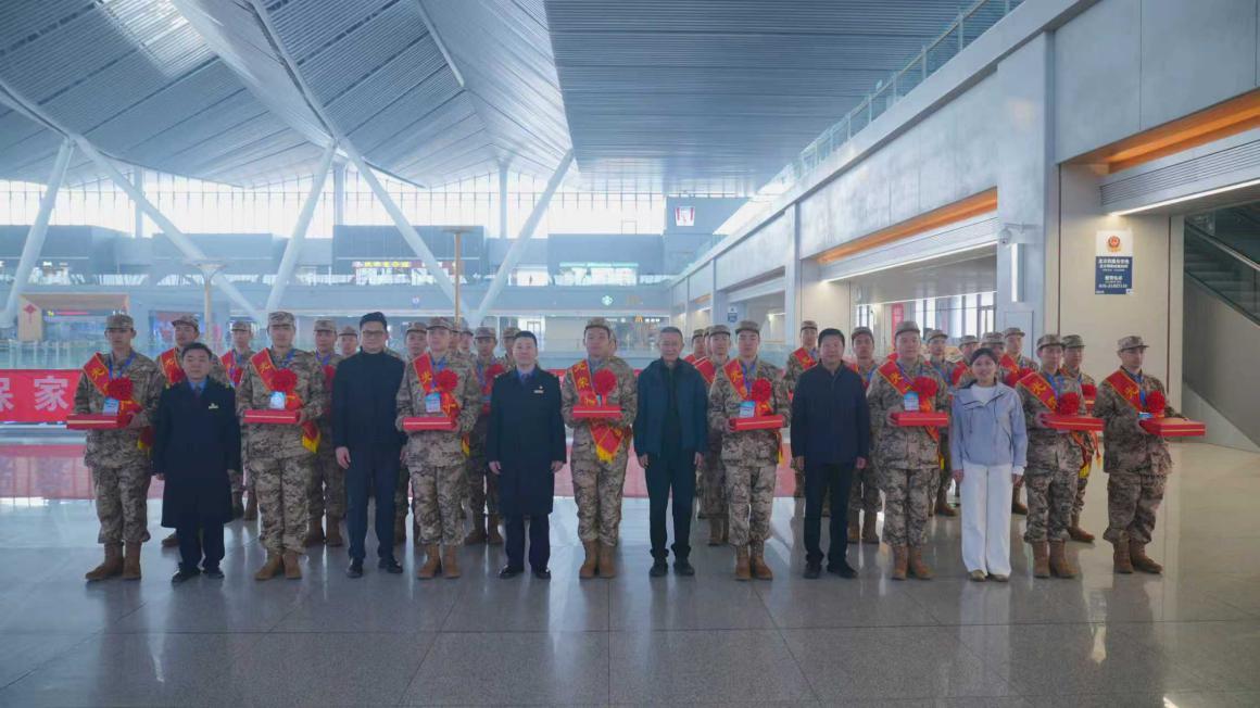 專屬候車區裏,35名朝陽籍新兵整裝待發,列隊整齊、精神抖擻。新兵們獲得了朝陽區雙擁辦精心準備的擁軍紀念禮盒——紅色的水杯和筆記本上印有“愛國奉獻、參軍光榮”的字樣,寓意“飲水思源、書寫榮光”。大家合影留念,新兵們身姿挺拔、士氣高昂,用熱烈的掌聲和響亮的口號回應這份來自家鄉的深情厚誼。