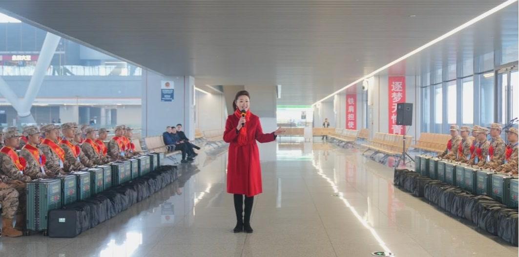 話音未落,快板演員以鏗鏘節奏、朗朗詞句演繹《軍營新歌》,將多彩軍營生活娓娓道來,瞬間點燃現場氛圍——這是朝陽區爲新兵們精心策劃的快閃節目,以文藝之名,送家鄉之情。緊接着,一曲激昂的軍歌驟然響起,歌者從新兵方陣身後緩步走出,嘹亮的歌聲在候車區迴盪;當《強軍戰歌》的旋律響起時,領唱歌手帶動全場新兵齊聲高唱,“聽吧新徵程號角吹響,強軍目標召喚在前方……”歌聲響徹雲霄、氣勢如虹,將整場快閃推向高潮。短短十餘分鐘,沒有繁瑣的串場,卻用最真摯的藝術表達,讓每一名新兵在出徵前感受到家鄉人民最深情的禮讚。