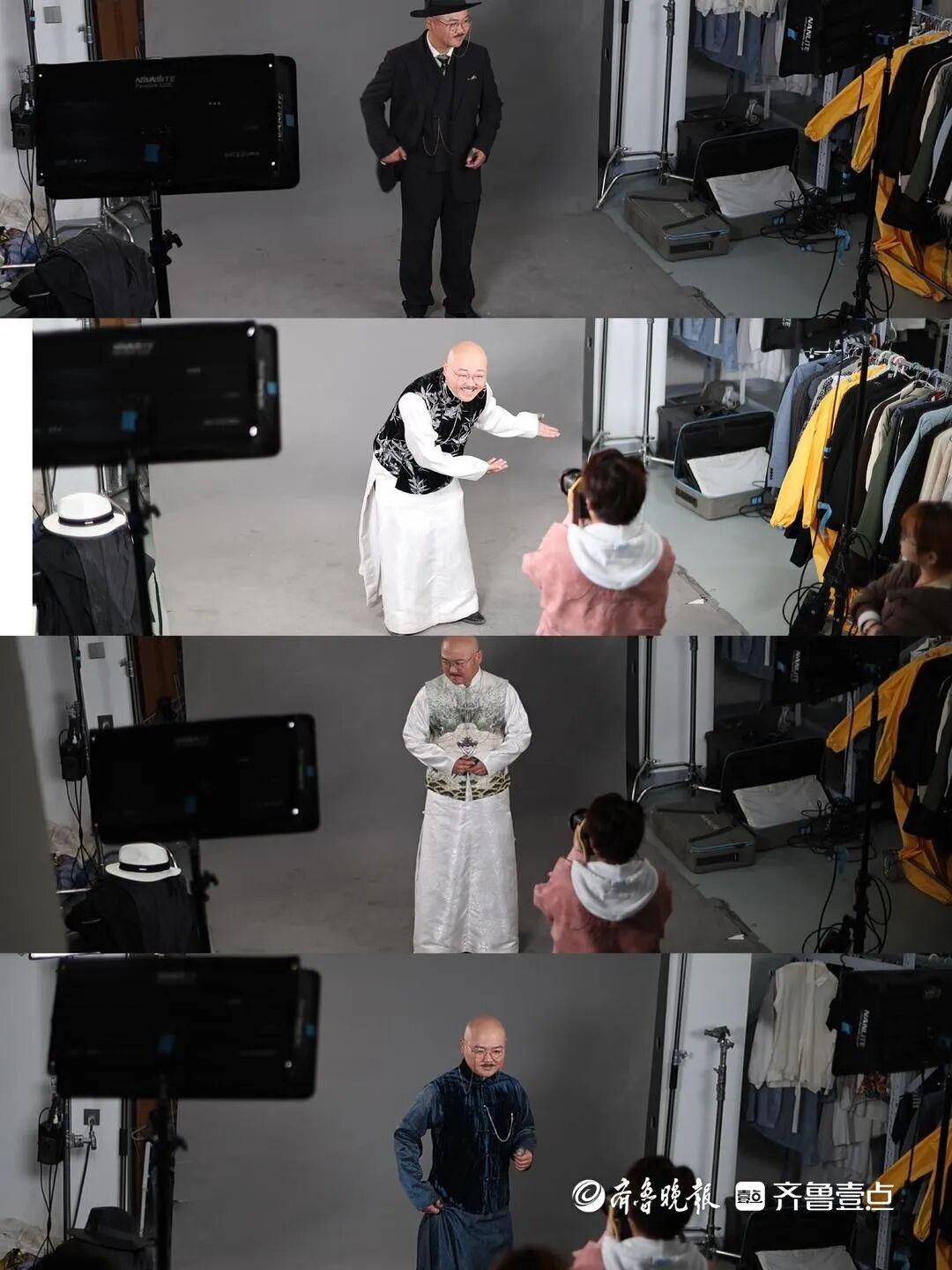從上午9點到下午1點,冀星軍在試衣間和化妝間來回倒騰,試穿了五套長衫和一套西裝。