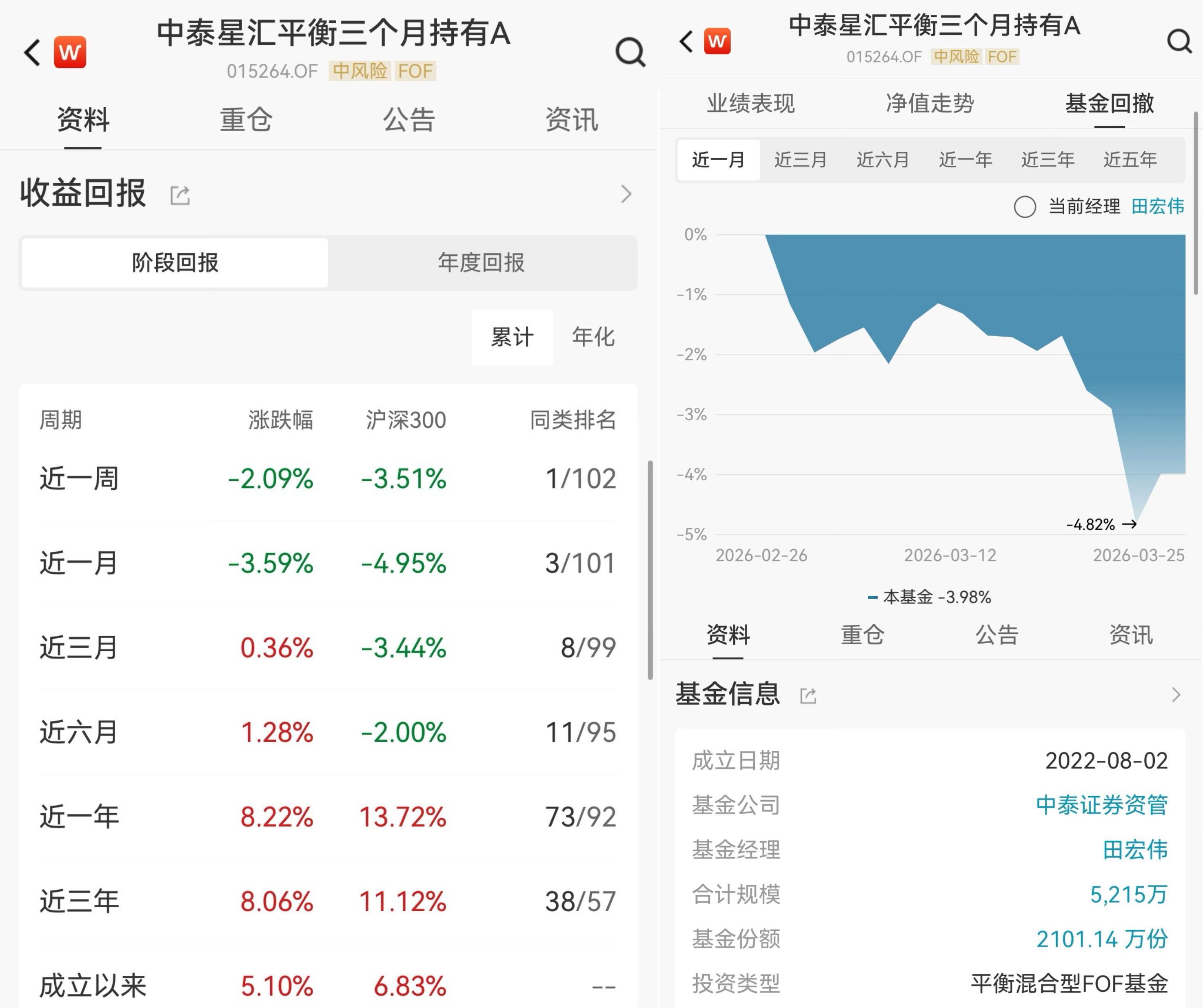 中泰星匯平衡三個月持有A(015264.OF)近一週收益率爲-2.09%,近一個月收益率爲-3.59%,近一個月最大回撤爲-4.82%。