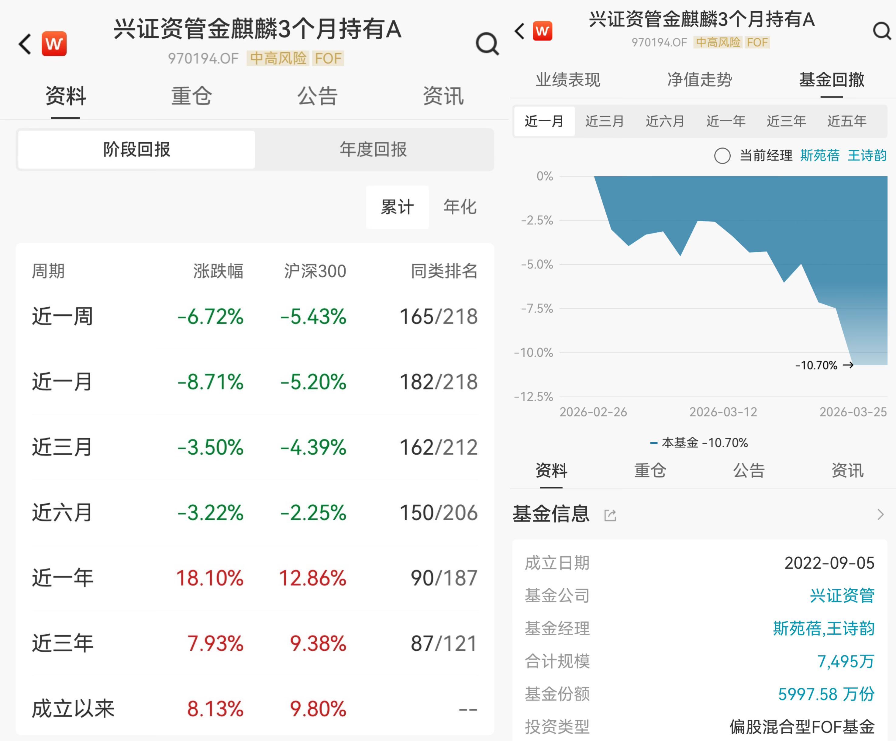 藍鯨新聞記者關注到,部分券商資管旗下FOF產品因重倉相關資產,配置策略出現階段性承壓,導致部分產品短期表現不佳,其中包括渤海匯金優選進取6個月持有A(018674.OF)、興證資管金麒麟3個月持有A(970194.OF)、國泰海通君得益三個月持有A(952013.OF)、中泰星匯平衡三個月持有A(015264.OF)等。