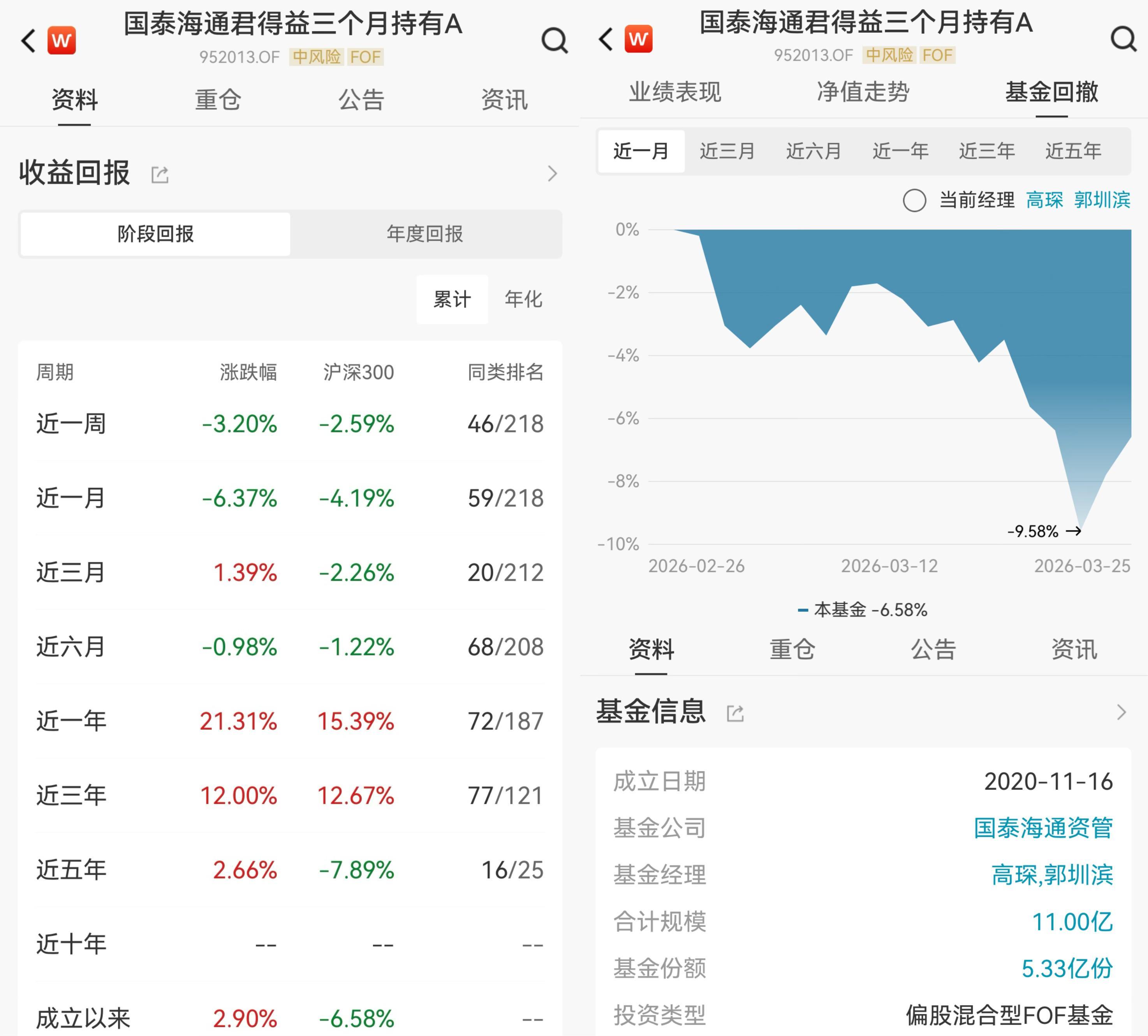 然而,該FOF近期收益回報跑輸滬深300。其近一週收益率-3.2%,近一個月收益率-6.37%,同期滬深300收益率分別爲-2.59%、-4.19%;該FOF近一月最大回撤達-9.58%。