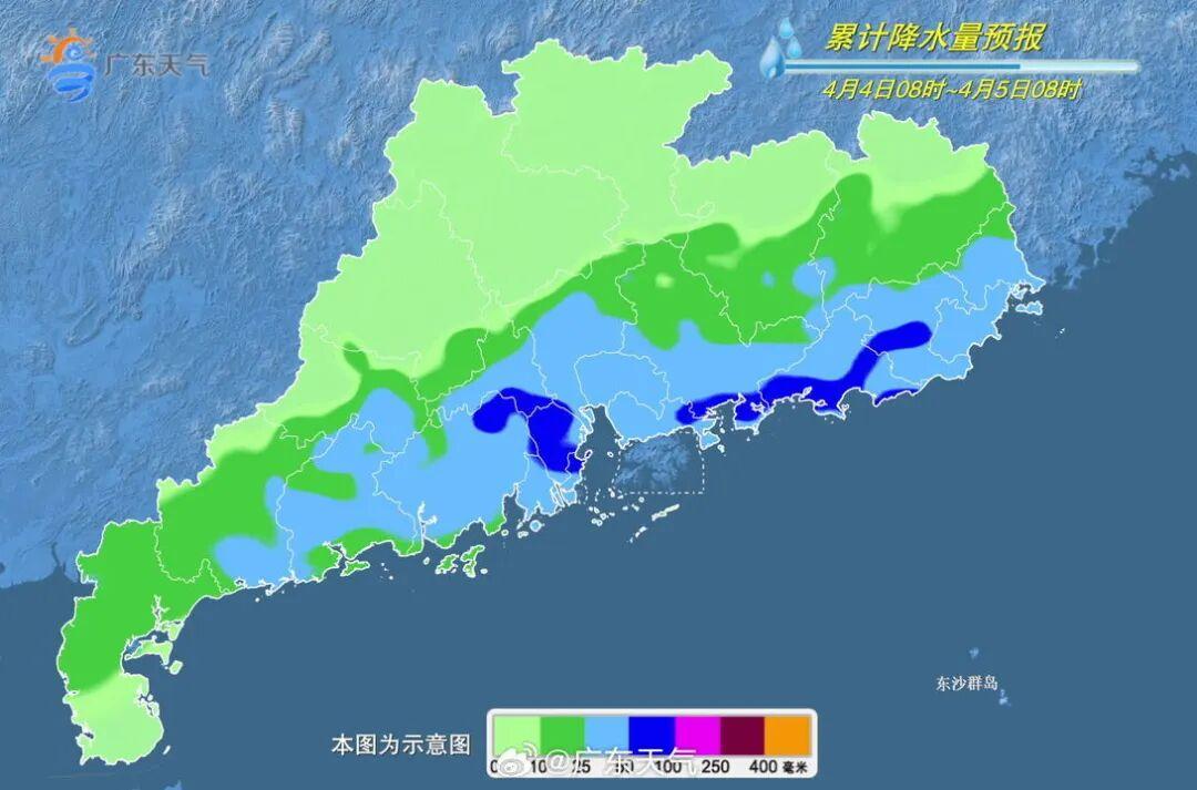 4月2日夜間—4月4日,廣東中北部市縣有大雨局部(大)暴雨,南部市縣有中雷雨局部(大)暴雨,大部分市縣雷雨時伴有8~10級(局地11級)短時大風、短時強降水和局地小冰雹;4日白天中北部降雨逐漸減弱。3日白天最高氣溫:雷州半島31~34℃,粵北的北部市縣25~27℃,其餘市縣28~29℃。