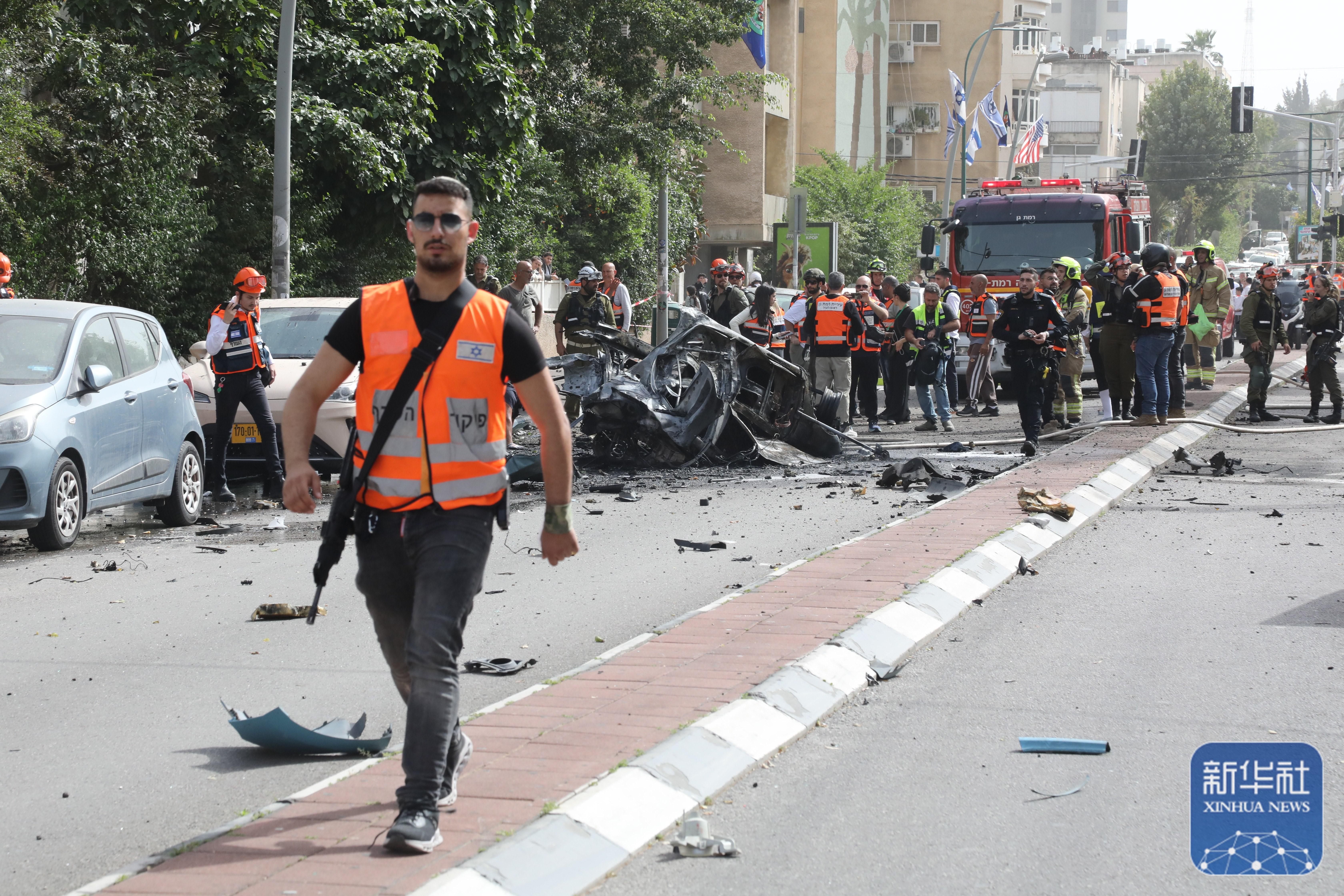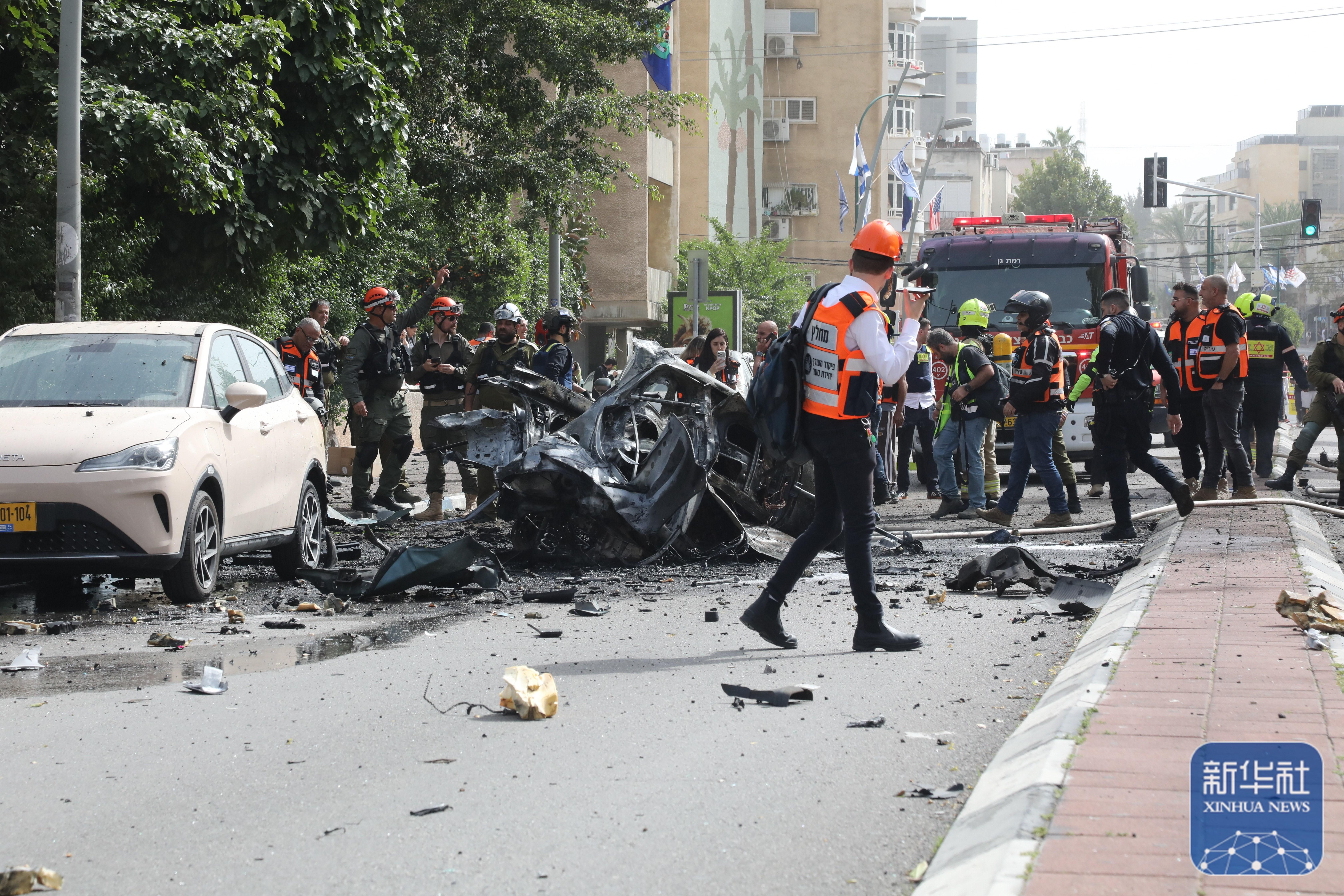 ↑4月4日,在以色列中部城市拉馬特甘,應急反應人員在導彈襲擊現場參與處置。新華社發(吉德翁·馬科維奇攝/基尼圖片社)