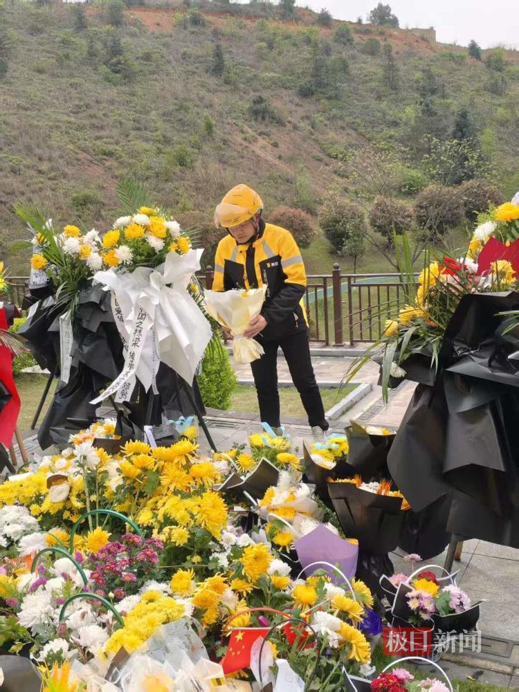 4月4日是今年清明假期第一天,極目新聞記者在長沙唐人萬壽園袁隆平墓地看到,有外賣小哥受網友委託,攜帶鮮花前來祭掃袁隆平院士。
