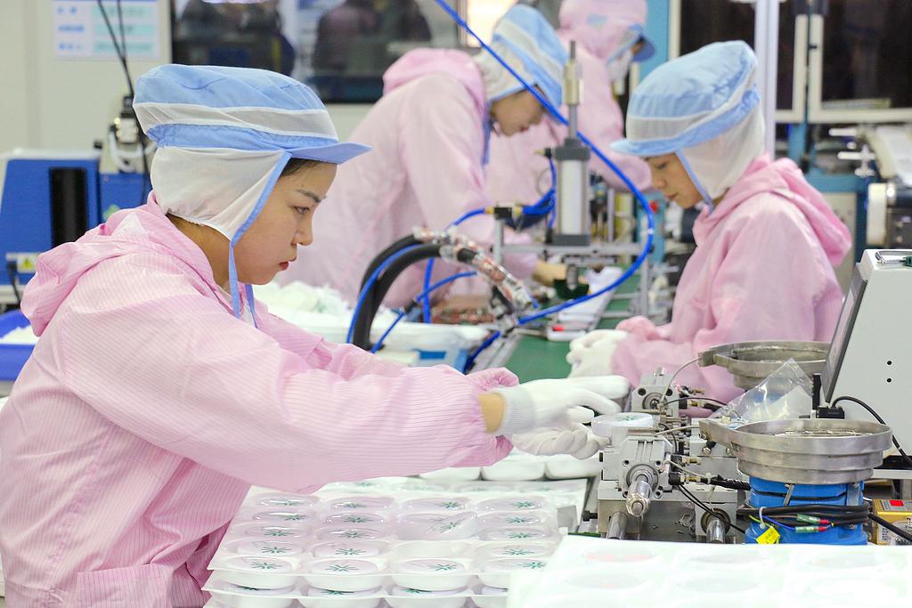 2025年2月7日,紹興一家臺資企業的工人們在生產線上組裝化妝品容器。圖源:視覺中國