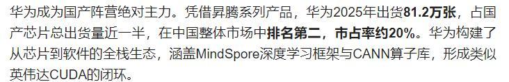 2025 年,升騰全年出貨 81.2 萬顆 AI 芯片,佔中國整體市場 20%,穩居國產廠商第一、全市場第二,成爲英偉達份額下滑的最大受益者。