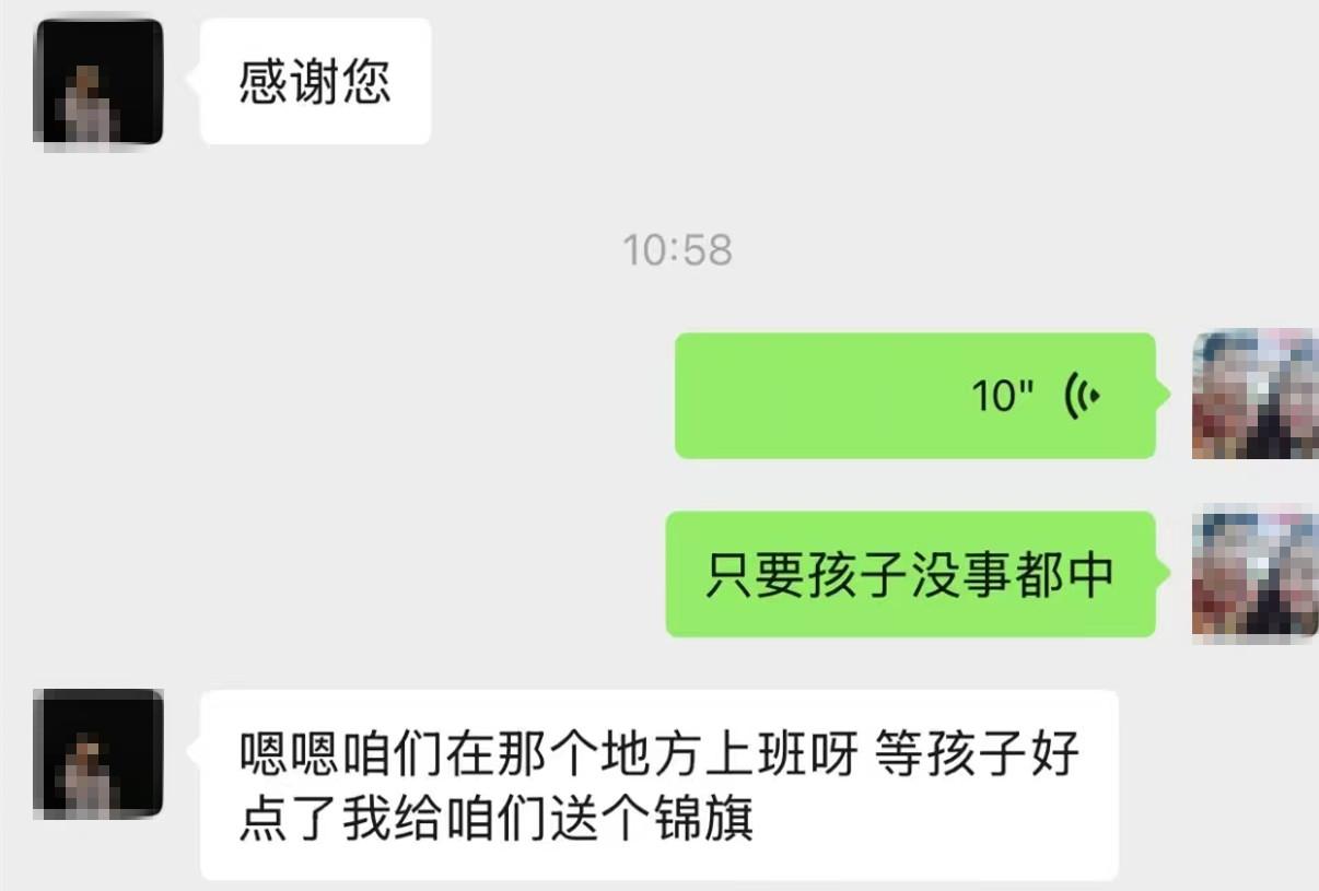 “我看她抱孩子抱不動想幫她,孩子不願意,我就幫着辦住院,後來孩子父親加我,還多給我錢,要送錦旗。”梁先生表示檢查後孩子應該是燙傷,家長後來回覆他說孩子情況好多了。