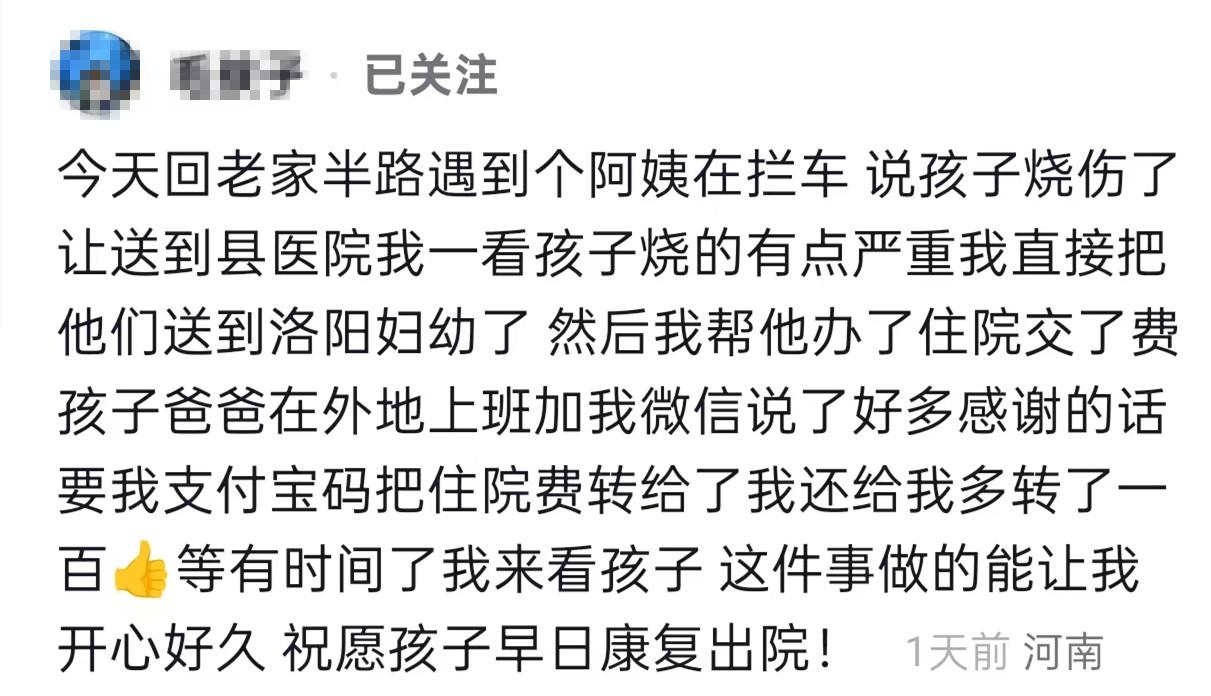 4月13日,一位河南網友發視頻稱,自己回老家時半路遇到一位阿姨攔車,說孩子受傷問能否幫忙送到縣醫院,他遂讓孩子上車,並在到醫院後幫忙辦理住院繳費。
