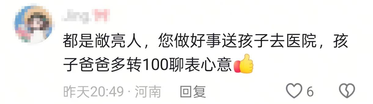 事後在外地上班的孩子父親聯繫他,表達感謝並轉給網友孩子住院費,該網友表示“孩子父親多轉了錢”。視頻發佈後引發網友點贊,“封你爲河南第一帥”“厲害爺們”“祝孩子早日康復”“孩子父親也是敞亮人”……