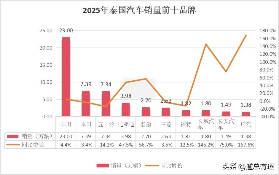 從數據來看,日系車衰落、中國汽車崛起的變化趨勢在一些國家已經出現。以東南亞爲例,一直以來,東南亞都被視作日本汽車的“後花園”,比如泰國,以前九成以上的市場被日系車佔據。而根據2025年的銷量情況,日系車的市場佔有率跌破70%關口,降至68.4%,較此前大幅縮水,相反,比亞迪、名爵、長城等我國汽車品牌的增長勢頭驚人。