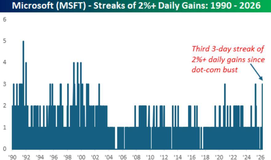 更引人注目的復甦來自傳統軟件和雲計算巨頭微軟。公司在短短3個交易日裏上漲11%,市值增加近3000億美元。市場研究公司Bespoke的統計顯示,本週也是老牌科技巨頭自互聯網泡沫破滅以來,第三次出現連續三日漲幅均超過2%的情況。