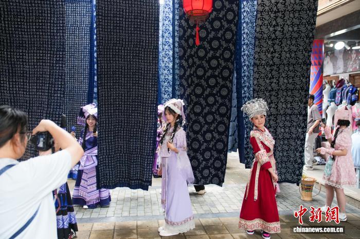 4月17日,廣西南寧,民族風情濃郁的南寧相思小鎮吸引不少民衆前來租賃服裝拍攝寫真、觀看特色表演,享受“三月三”假期時光。圖爲遊客在相思小鎮一處掛滿蠟染布料的打卡點拍照。中新社記者 陳冠言 攝