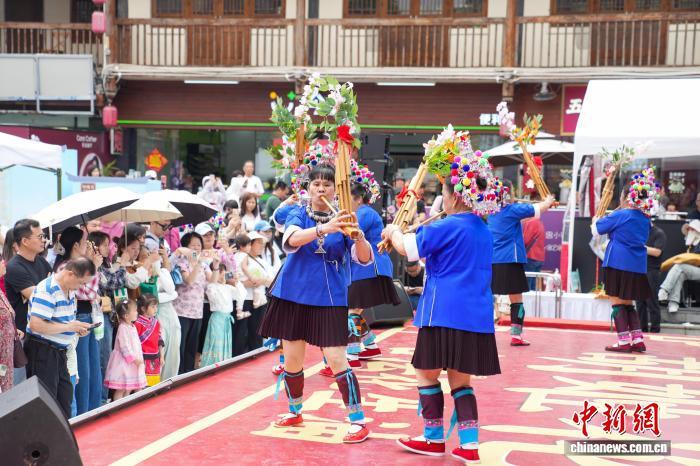 4月17日,廣西南寧,民族風情濃郁的南寧相思小鎮吸引不少民衆前來租賃服裝拍攝寫真、觀看特色表演,享受“三月三”假期時光。圖爲蘆笙表演吸引遊客。中新社記者 陳冠言 攝