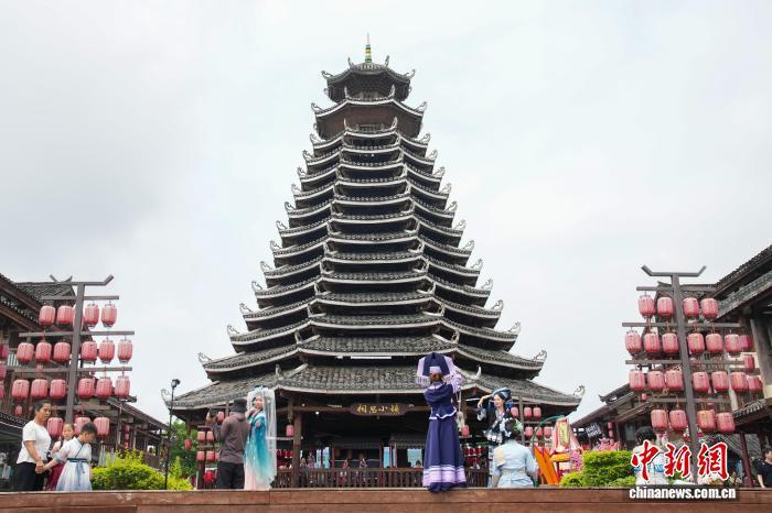 4月17日,廣西南寧,民族風情濃郁的南寧相思小鎮吸引不少民衆前來租賃服裝拍攝寫真、觀看特色表演,享受“三月三”假期時光。圖爲遊客在相思小鎮的鼓樓前拍照。中新社記者 陳冠言 攝
