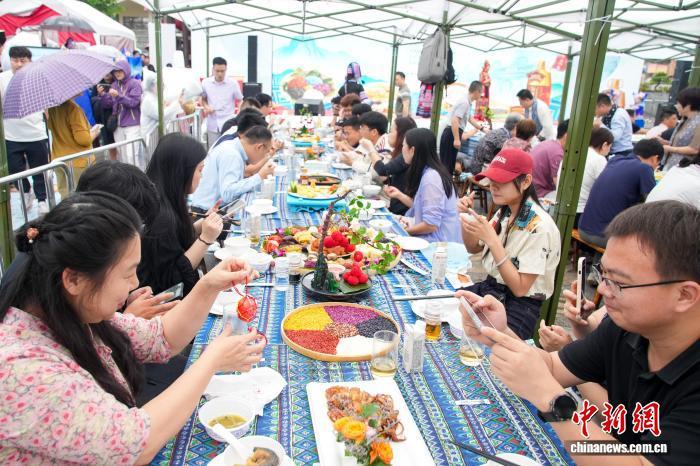 4月17日,廣西南寧,民族風情濃郁的南寧相思小鎮吸引不少民衆前來租賃服裝拍攝寫真、觀看特色表演,享受“三月三”假期時光。圖爲遊客享用長桌宴。中新社記者 陳冠言 攝