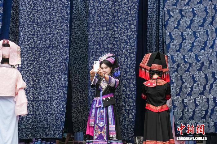 4月17日,廣西南寧,民族風情濃郁的南寧相思小鎮吸引不少民衆前來租賃服裝拍攝寫真、觀看特色表演,享受“三月三”假期時光。圖爲遊客在相思小鎮一處掛滿蠟染布料的打卡點自拍。中新社記者 陳冠言 攝