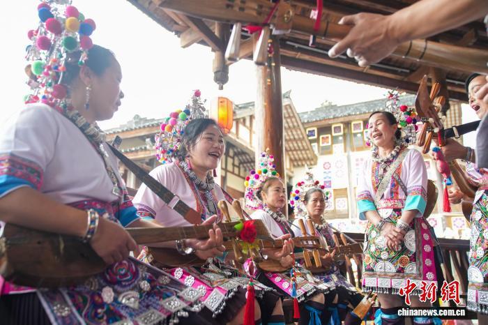 4月17日,廣西南寧,民族風情濃郁的南寧相思小鎮吸引不少民衆前來租賃服裝拍攝寫真、觀看特色表演,享受“三月三”假期時光。圖爲表演者在鼓樓彈唱侗族歌曲。中新社記者 陳冠言 攝