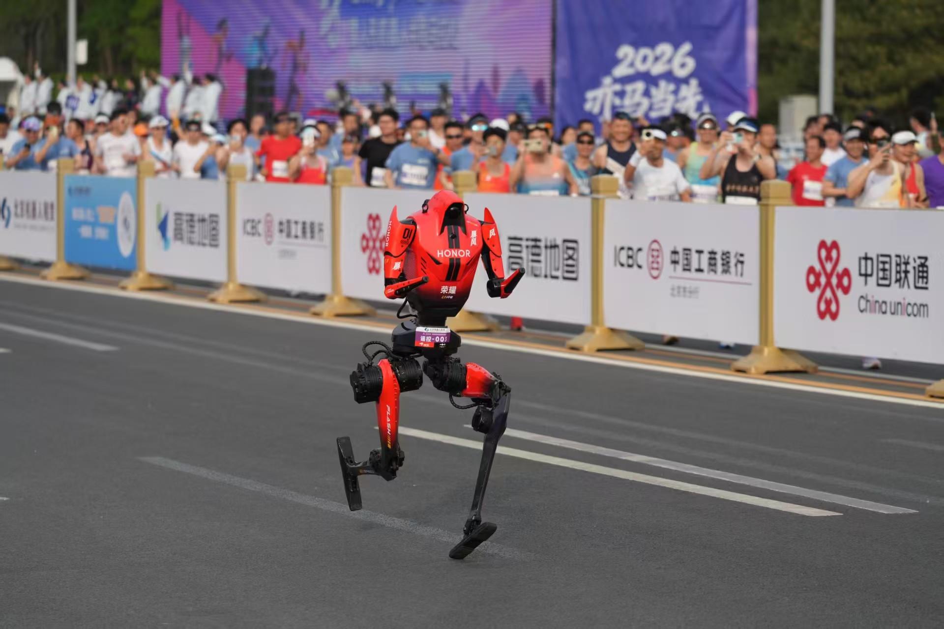 4月19日上午,北京亦莊人形機器人半程馬拉松賽道終點附近,圍觀人羣的目光緊緊跟隨着一道紅色的身影。最終,由榮耀“閃電”機器人組成的齊天大聖隊斬獲賽事冠軍。這一成績也超越了烏干達名將基普利莫在今年3月創造的57分20秒人類紀錄。當天,榮耀旗下不同技術方案組成的多支機器人戰隊包攬了本次比賽的前三名。