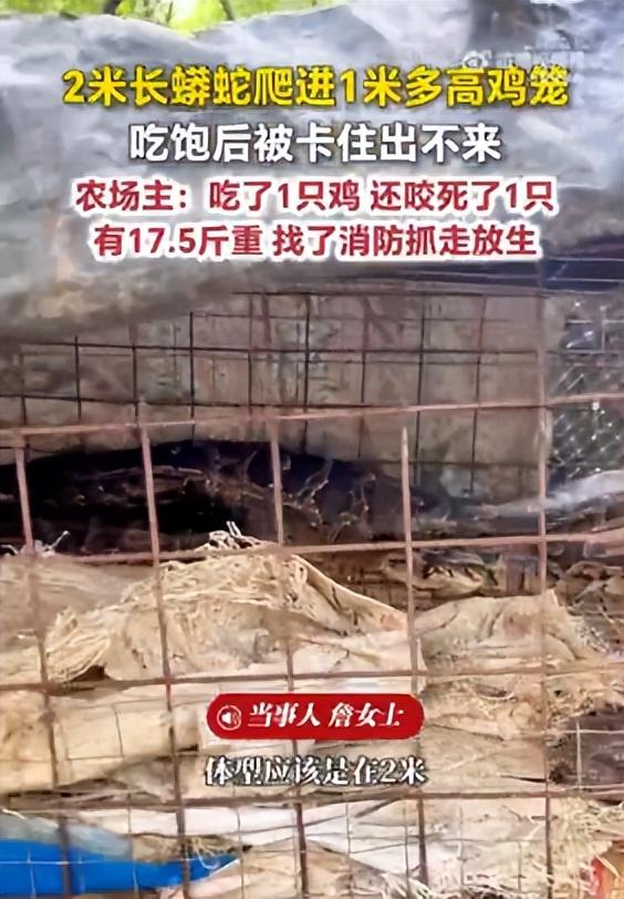 近日,福建漳州一條2米長蟒蛇爬進1米多高雞籠,喫飽後被卡住出不來。當事人詹女士稱,早上去餵雞發現的,雞籠裏面有7只雞,一隻被喫一隻被咬死,後來叫了消防抓走放生了,有17.5斤重。