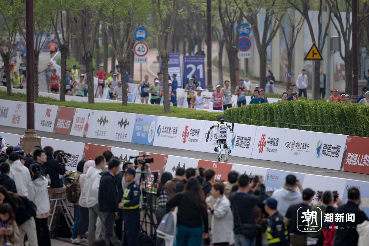 今年反過來了。賽道邊有人衝着人類選手喊“加油,超它!”——超的對象是跑在前面的機器人。