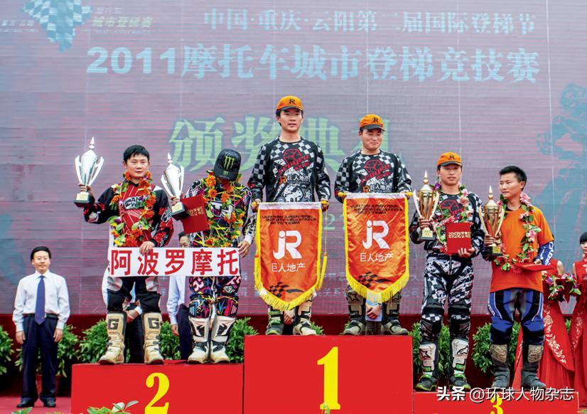 ·2011年9月27日,張雪(前排左一)參加重慶雲陽摩托車城市登梯競技賽,並代表阿波羅摩托獲得第二名。(視覺中國)