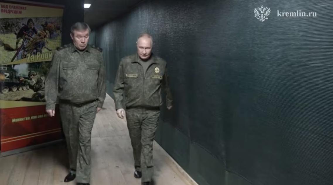 現場畫面顯示,普京一身戎裝,俄聯邦武裝力量總參謀長格拉西莫夫則緊跟在他身旁,邊走邊跟他彙報情況。