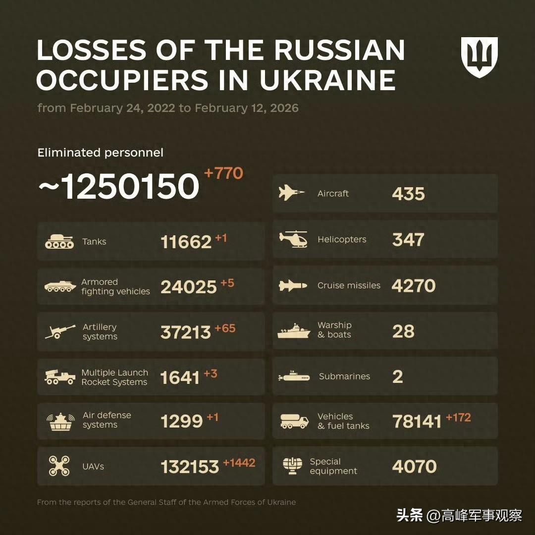 烏軍戰場上的表現,可以從烏克蘭後方一望無際的陣亡烏軍墓地看出來。雖然烏克蘭軍隊在整體軍事實力上處於絕對弱勢,而且一直在後退失土,但烏軍的戰鬥力也是看得見的。2月12日,烏克蘭國防部發布今日大本營戰報,自頓巴斯特別軍事行動以來,累計消滅了大約125萬俄軍。當然,這個烏克蘭軍方的宣傳數字可能包含較大水分,但足以證明俄軍每一次勝利都要付出較大傷亡代價。