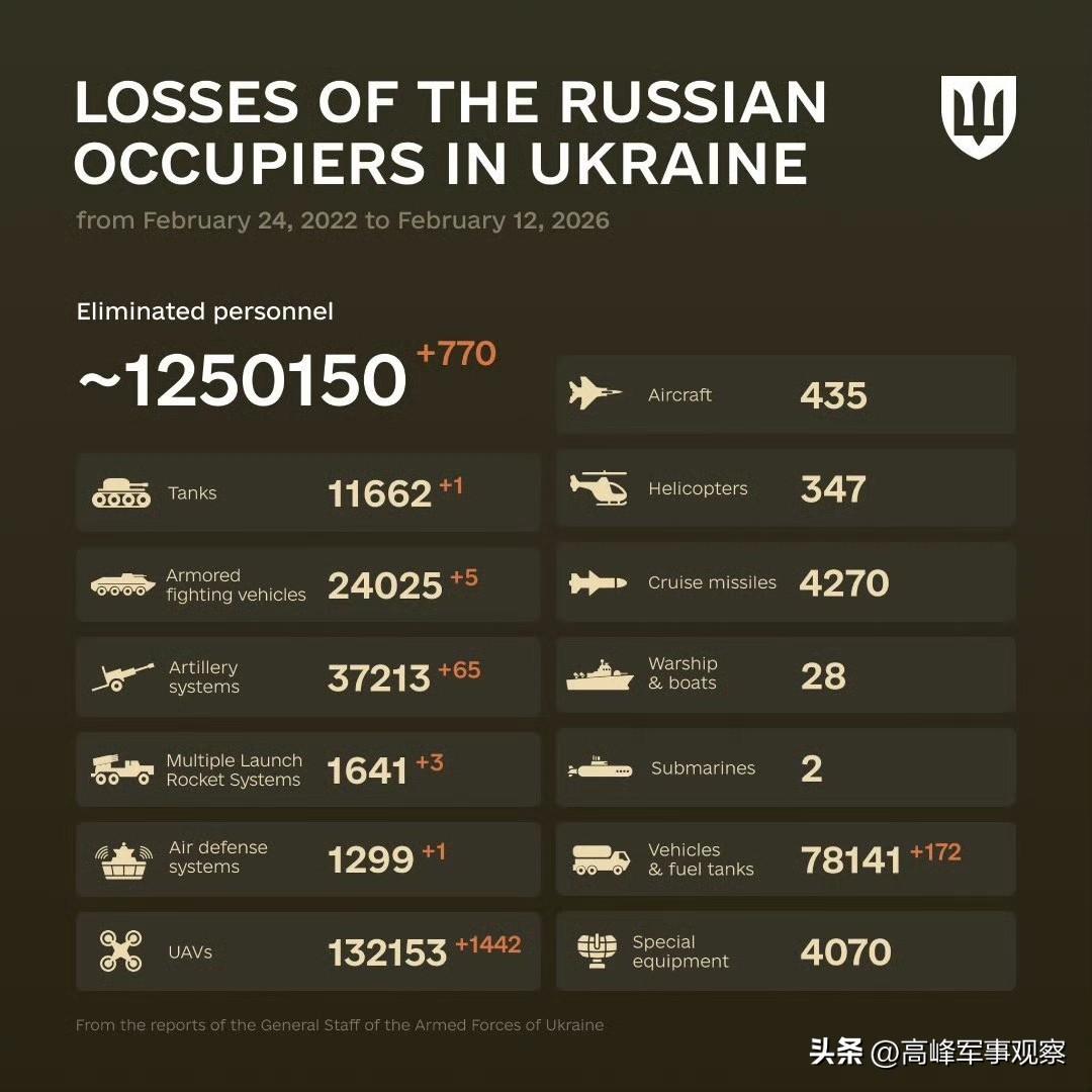 以此類推,完全解放扎波羅熱,俄軍需要損失115萬人,而哈爾科夫和第聶伯彼得羅夫斯克則需要損失550萬人。 不過澤連斯基的說法,與烏克蘭軍方的最新戰報“自相矛盾”。烏克蘭國防部2月12日發佈的戰報顯示,自頓巴斯特別軍事行動以來,累計“消滅”125萬俄軍。很明顯,澤連斯基的說法站不住腳。