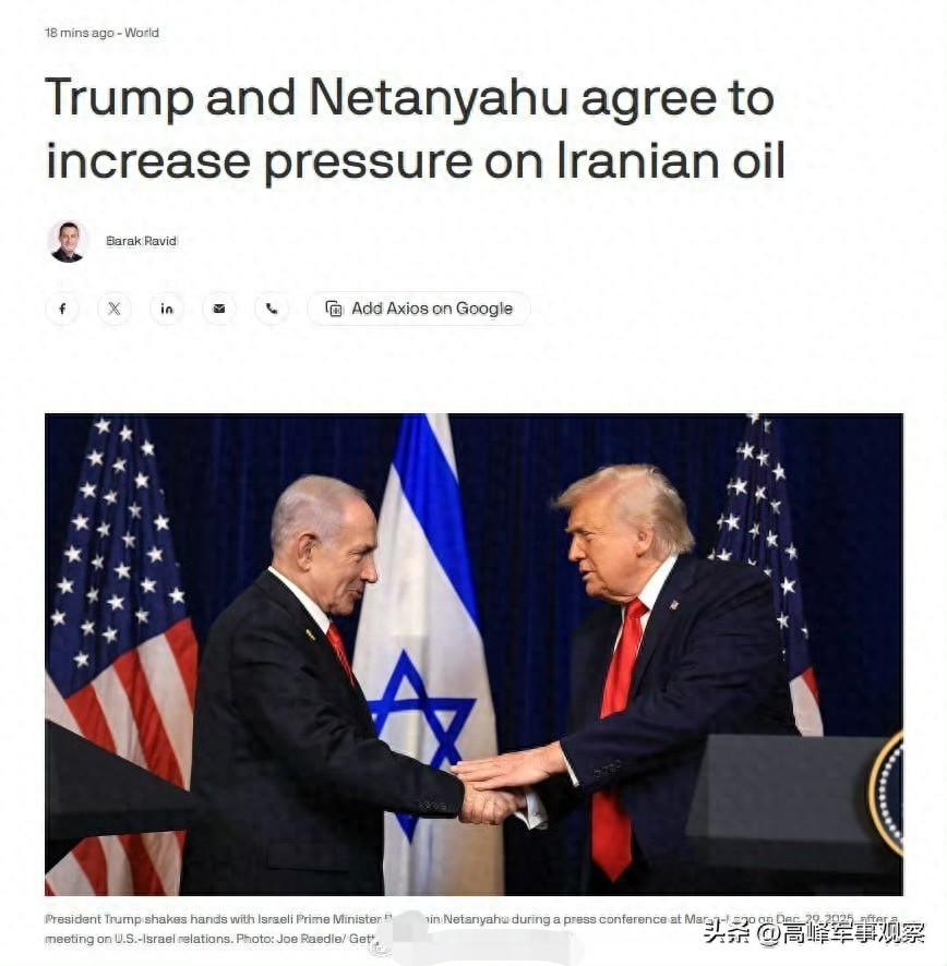 美以在伊朗問題上達成基於妥協的一致意見。以色列尊重美方的想法,同意把軍事打擊手段作爲第二步解決方案。根據美國數字新聞網(Axios)的報道,美國總統特朗普與以色列總理內塔尼亞胡已同意加強對伊朗的經濟施壓,包括減少伊朗對華油出口。美國官員表示,重啓的對伊朗“極限施壓”行動將與核談判同步進行,同時美國還在中東繼續進行軍事部署,以防外交努力失敗。