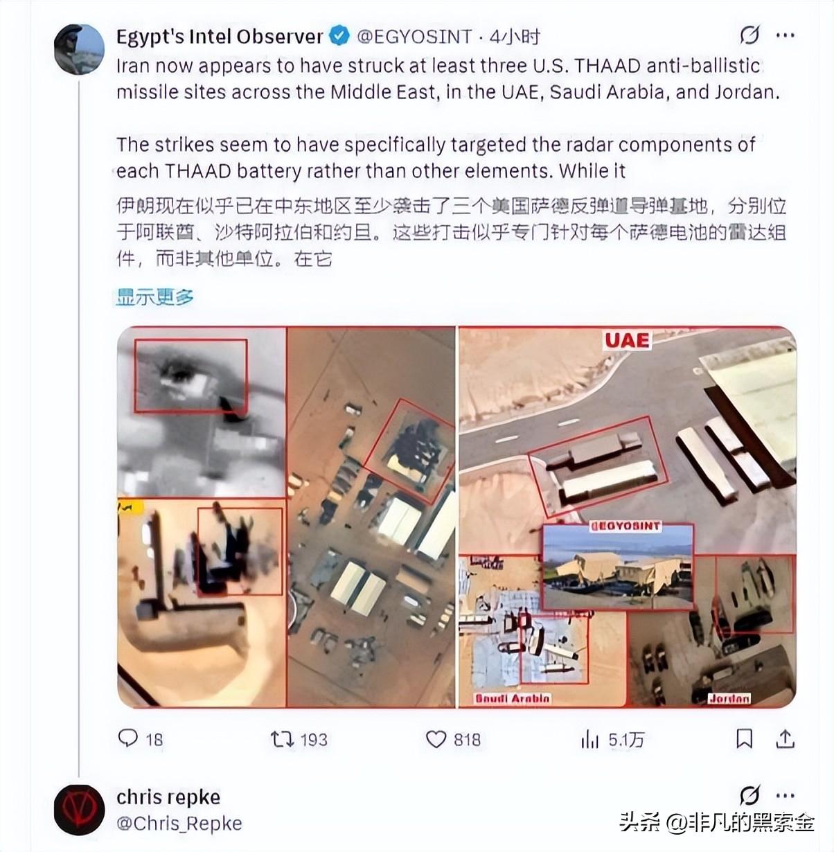 另據報道,3月5日伊朗取得了如下戰果:美軍被摧毀3套薩德系統(阿聯酋魯韋斯基地 2 套,約旦穆瓦法克・薩爾蒂基地 1 套)。