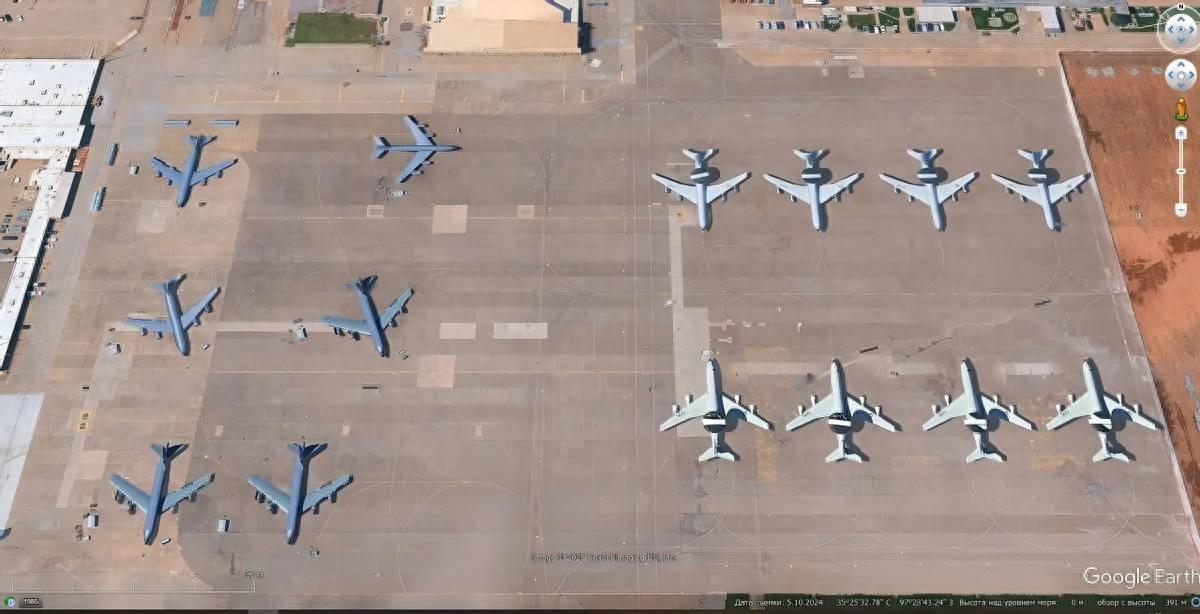 在廷克空軍基地的波音E-3G哨兵無人機和波音KC-135R Stratotanker加油機