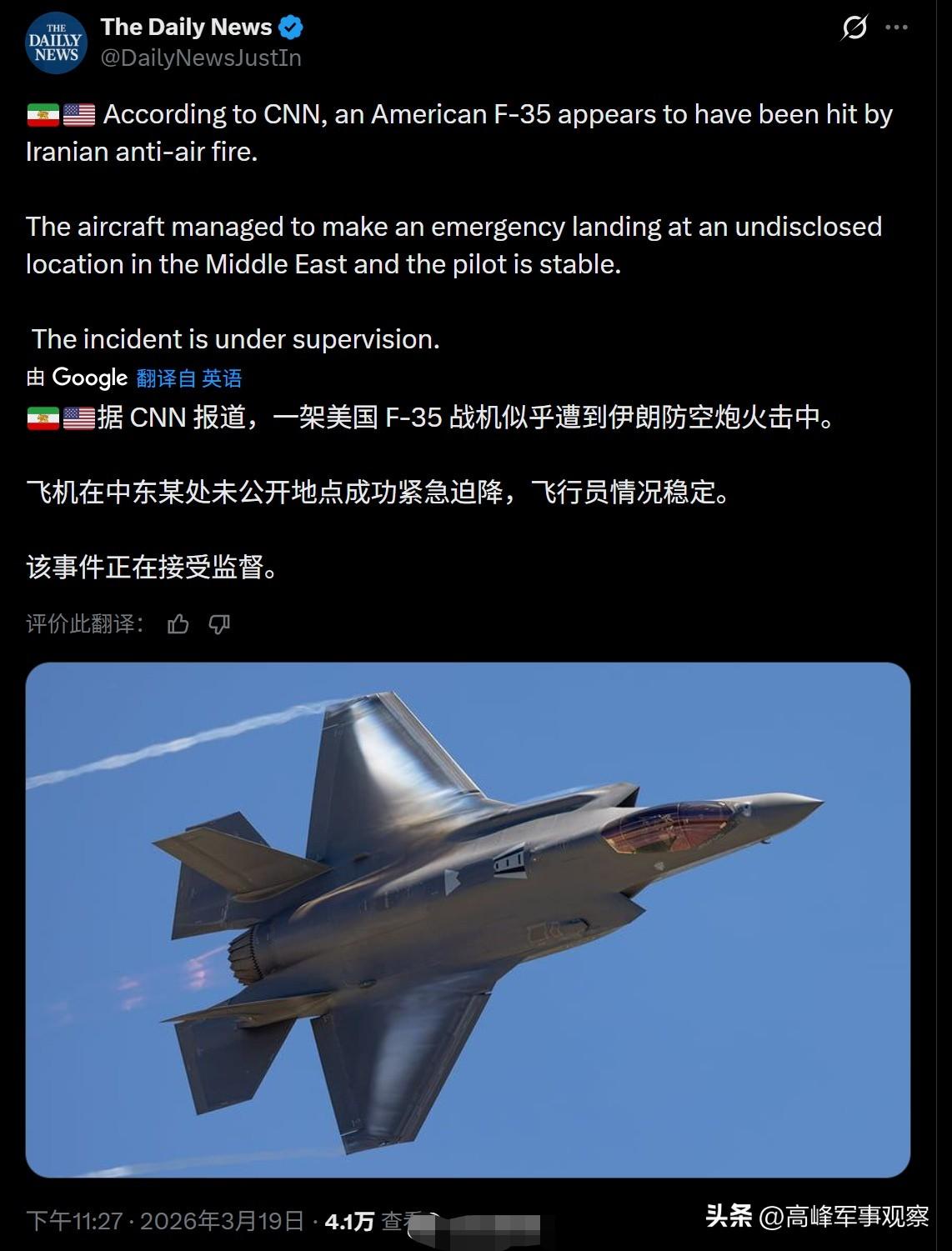 話不能亂說,這句話是有道理的。3月19日,美國總統對媒體表示,伊朗的防空系統已經被徹底摧毀,對美軍飛機已經毫無威脅了。他說“我們想去哪兒飛就去哪兒,根本沒人朝我們開火”。然而,特朗普話音剛落,伊朗就成爲首個擊中美軍F-35 第五代隱形戰鬥機的國家。美國中央司令部承認一架F-35戰機被伊朗防空系統擊落。並表示,這架飛機在中東某基地緊急迫降;飛行員安然無恙。