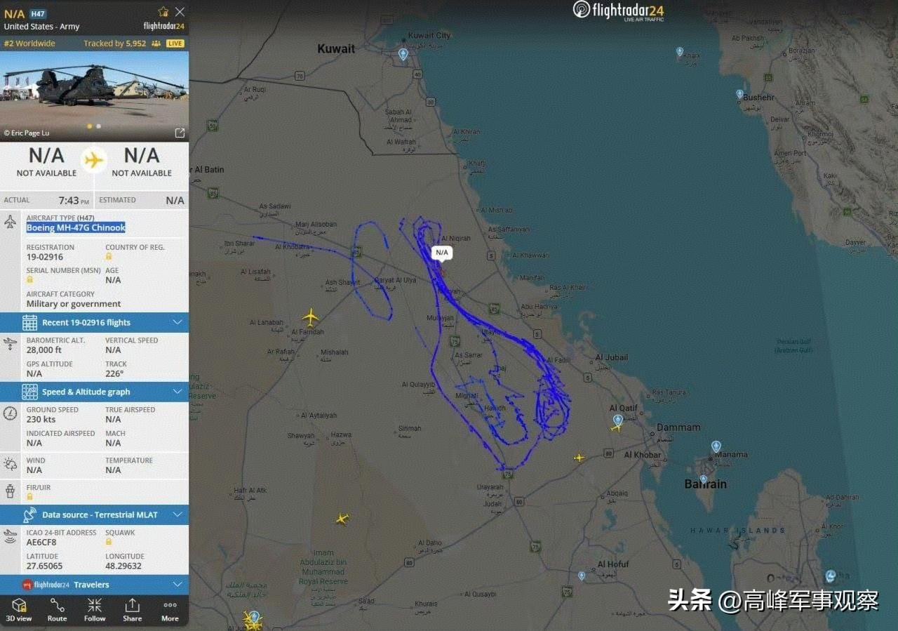 一架美國陸軍的CH47“支奴幹”直升機在沙特東部區域上空格外謹慎地高頻飛行