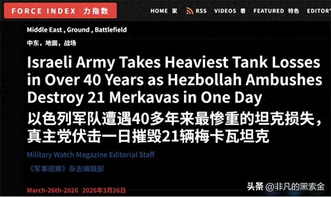 根據美國《軍事觀察》雜誌報道,3月26日這一天,以色列國防軍引以爲傲的“梅卡瓦”主戰坦克遭遇了史無前例的慘敗——在不到24小時內,竟有21輛坦克被黎巴嫩武裝摧毀。