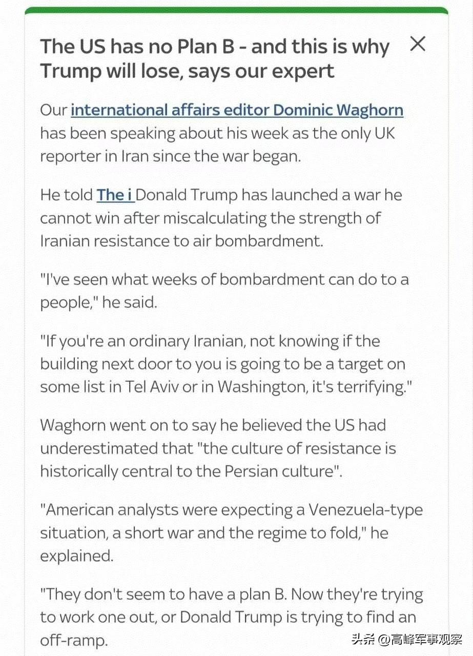 問題是,戰爭爆發才30天,美軍的計劃和預期就一再延遲、破滅。以至於很多西方媒體都對這場戰爭的結果做出悲觀判斷。英國《天空新聞》的報道稱,美國沒有B計劃,將在與伊朗的戰爭中失敗!特朗普陷入一場沒有勝利之路的戰爭,因爲他在計算伊朗人在空襲中的抵抗力時犯了戰略錯誤。 他原本預期會出現類似委內瑞拉的局面;即通過一場短期戰爭,迅速導致政權垮臺。