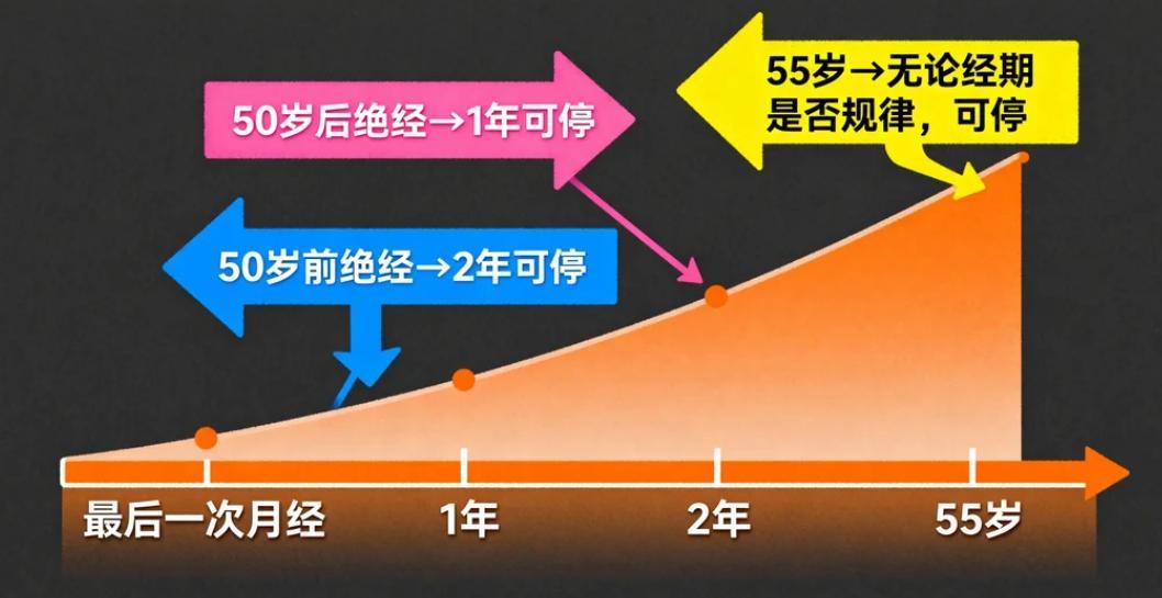 - 50歲後絕經:最後一次月經後滿1年,可考慮停止。