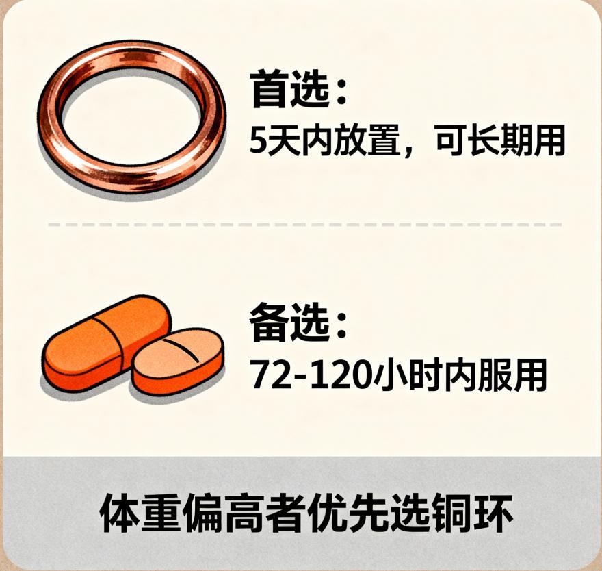 - 首選含銅宮內節育器:事後5天內放置均有效,且之後可作爲長期避孕措施。