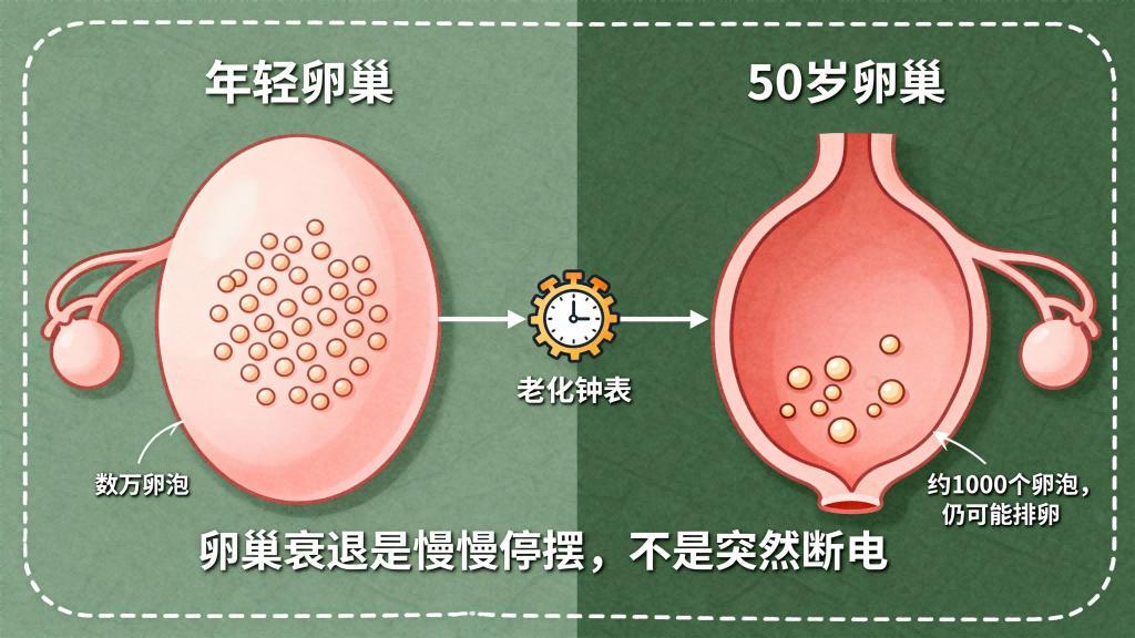 卵巢功能衰退是個漸進過程,並非突然“罷工”。醫學研究表明,50歲左右的女性卵巢內可能仍有約1000個卵泡。數量雖少,但只要有一個卵泡悄悄排卵,而你有過無保護性行爲,就可能懷孕。
