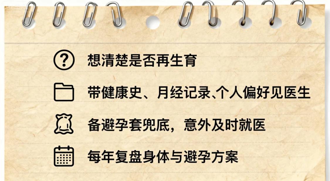 - 年度覆盤:每年評估一次身體狀況和現有避孕方式的適宜性,必要時調整方案。