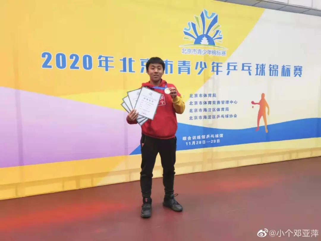 後來,林翰銘在求勝心和佛系之間找到了平衡,練球更加刻苦了。2020年,他終於傳來了好消息,一舉奪得北京市青少年乒乓球錦標賽男子單打冠軍。